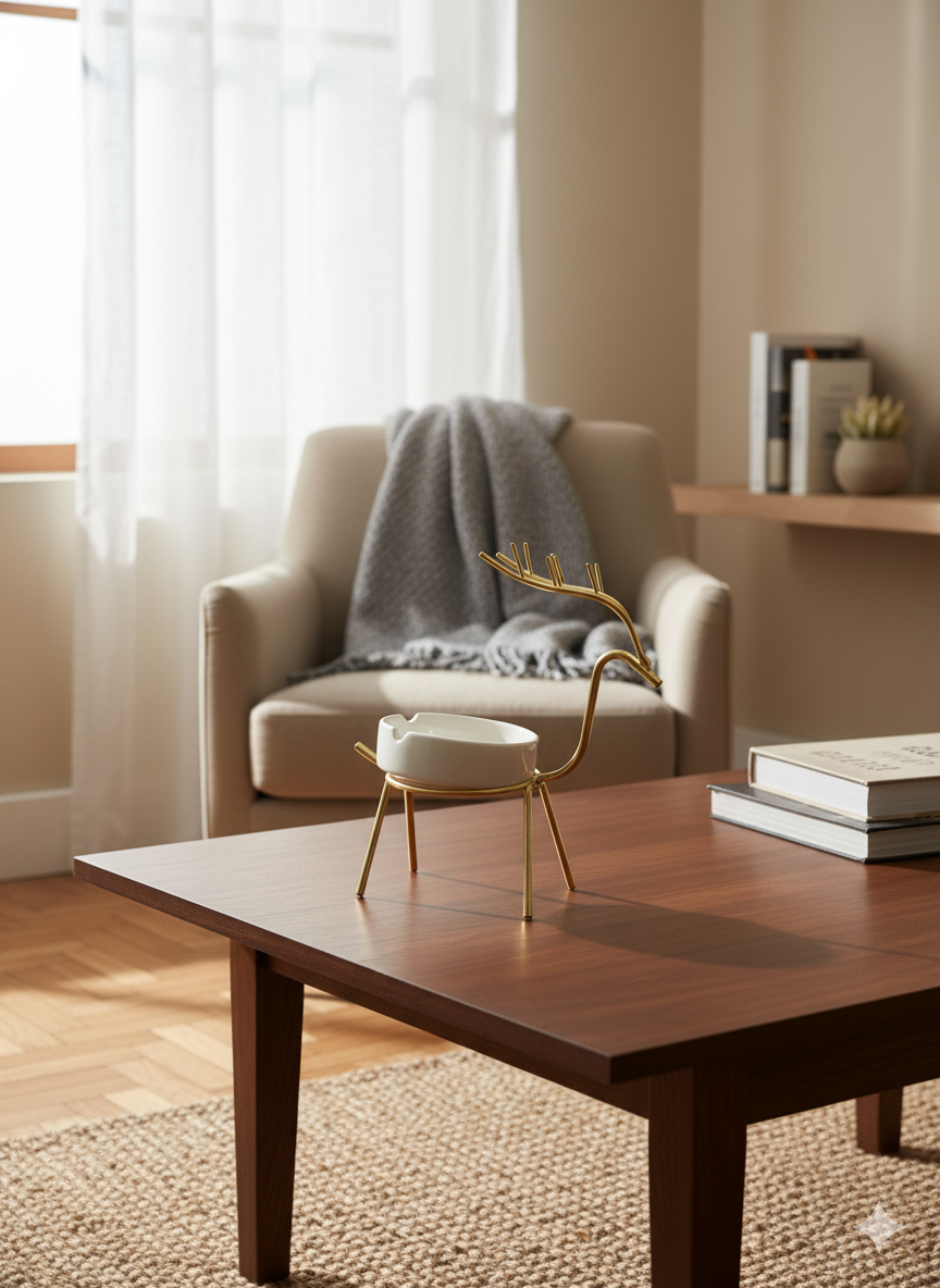 Add a playful yet elegant charm to your space with the Golden Reindeer Ceramic Holder. Designed with a sleek gold metal frame in the shape of a reindeer, it features a smooth white ceramic bowl that can be used as an ashtray, trinket holder, snack dish, or decorative accent. Its unique blend of modern artistry and festive flair makes it a perfect addition to living rooms, coffee tables, or office desks.